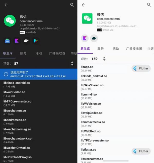 以国民App微信为例,通过应用架构查看软件LibChecker,我们发现国内应用市场的微信App原生库项数达到159个,且内置了自有的X5浏览器内核。而Google Play版微信的原生库数量仅为87个,内置浏览器内核也是调用的Google的Webview。
