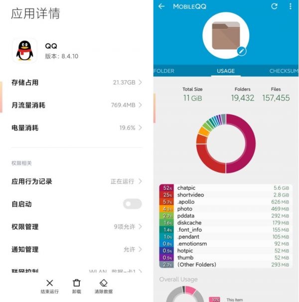在“小众软件”论坛,有网友对QQ占据超过20GB的手机空间进行了详细拆解,分析发现,仅Chatpic(聊天图片)和Shortvideo(聊天短视频)文件夹的内容,就占据了高达8.4GB的空间。