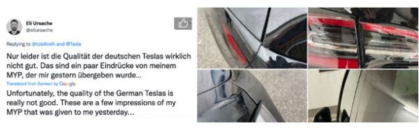 柏林工厂开工仪式上交付了30辆Model Y,已经有车主在社交网络上发出做工毛糙的抱怨:车辆的门缝、尾灯及无框玻璃等位置的缝隙都很大。