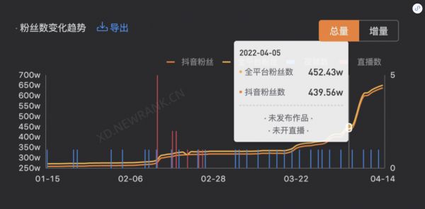 新抖数据(新榜旗下抖音数据平台 xd.newrank.cn)显示,李想在4月4日-4月10日,一周内抖音涨粉约188万。