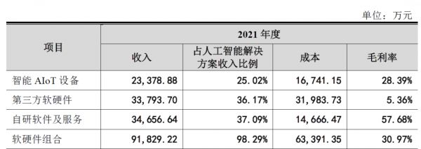 其中,第三方软硬件指的是外采其他公司通用硬件“过单”销售。自研软件服务中,由于2021年新基建需求增加,云从通过外采软件服务的方式分摊掉了原本可以自行开发的利润。而在智能AIoT设备中,云从主要采用的是JDM模式。