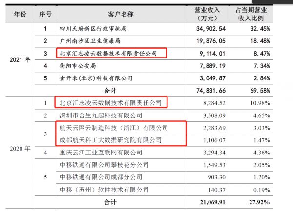 新客户数量下降的同时,其前五大客户中的汇志凌云、航天云网、成都航天科工都与航天信息( SH:600271) 有关系。