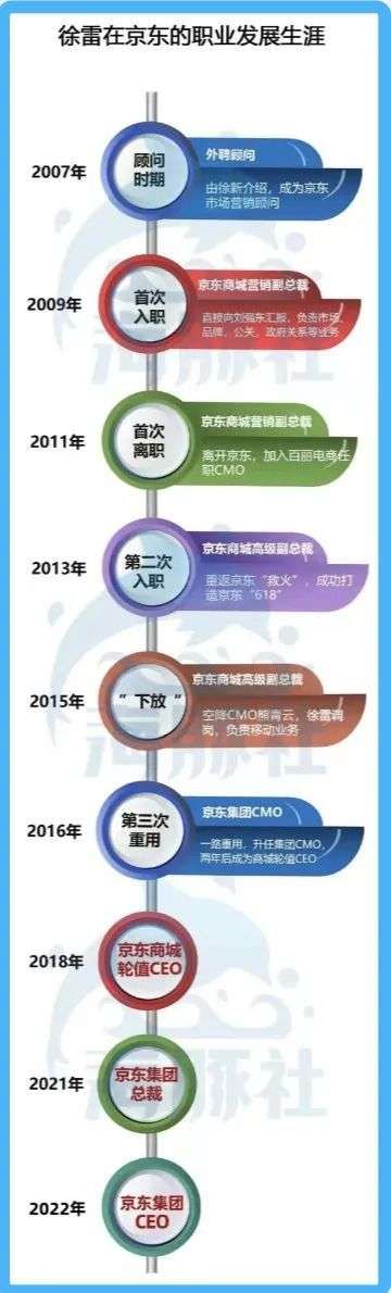 徐雷与京东的第一次合作短暂持续了2年就结束了,直到2013年2月再次回归,任职高级副总裁,负责市场营销工作。