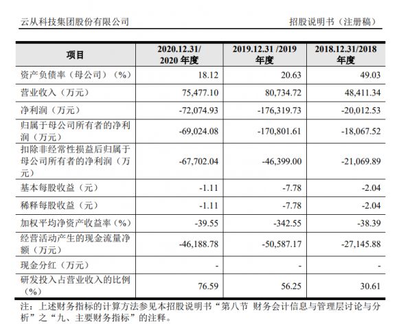 招股书显示,2018年2020年,云从科技研发费用分别是1.5亿元、4.5亿元、5.8亿元,占各期营收的比例分别是30.6%、56.3%和76.6%。