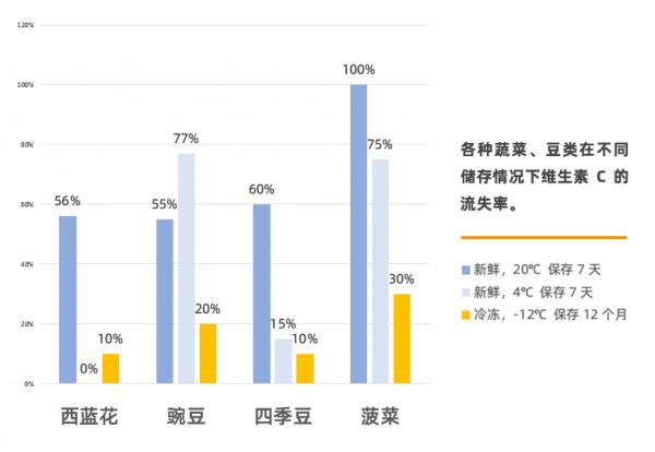 图片来源:丁香生活研究所图中黄色部分是速冻蔬菜维生素 C 流失率,可以发现相比于常温的两种保存方式,它的流失率的确低。