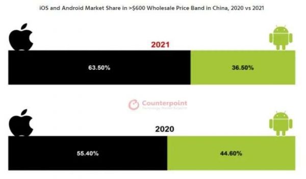 Counterpoint Research的研究报告显示,2021年,vivo、OPPO、小米、荣耀、华为五家厂商占据国内78%的智能手机市场份额,排在第三位的苹果为16%。但在高端市场,苹果却以一己之力拿下了63.5%的市场份额,其他安卓选手只能共同分食剩下的36.5%。