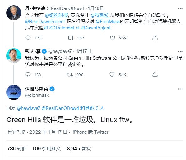 有网友指出,他的Green Hills Software其实与特斯拉存在竞争关系,而这家老牌企业在竞争中并不占有优势,因此他就希望通过“政治广告”的方式打压特斯拉。