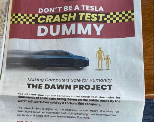 早就今年1月,一家名为The Dawn Project的组织向纽约时报投递广告,呼吁用户不要成为特斯拉全自动驾驶汽车的碰撞测试假人,而这个组织正是奥多德创立的。