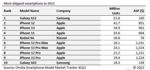 首先从市场竞争层面看,据市调机构Omdia发布的2021年全球最畅销10款手机显示,苹果占据7席,三星2席,小米1席。需要说明的是,虽然中国手机厂商小米的Redmi 9A入选前十,且位居榜单第五,但售价仅为78美元(约合496元人民币),是iPhone Pro系列的十分之一左右。