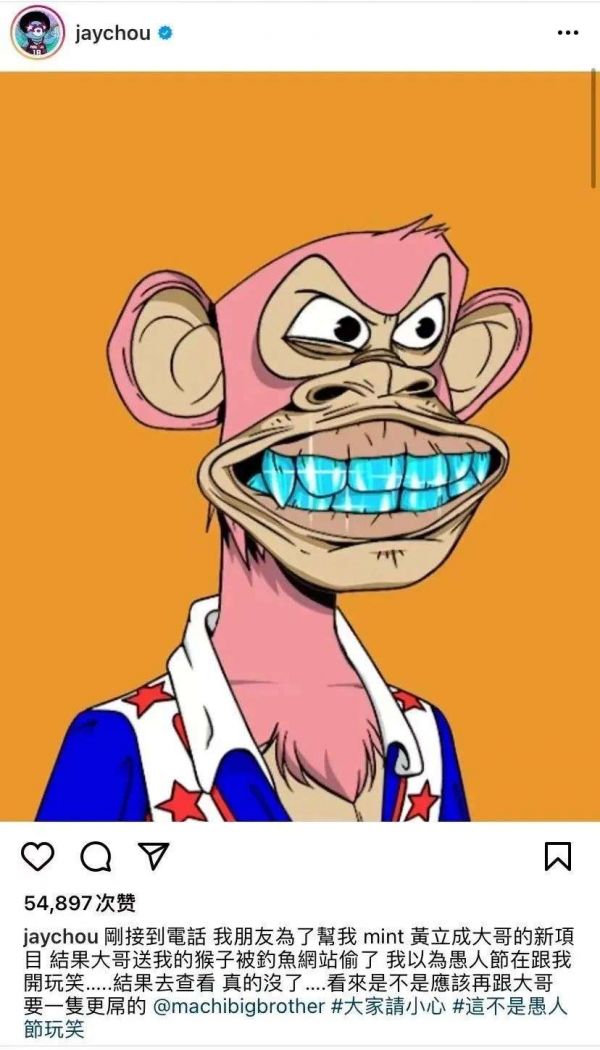 今年4月1日,周杰伦在社交账号上自爆自己的“无聊猿”NFT惨遭“钓鱼”,还强调不是“愚人节玩笑”。随后,有媒体报道,周杰伦被“钓鱼”的NFT不只一个,而是四个,钓鱼者随后把这些NFT卖掉了,据说一共卖出了169.6 ETH,约365万人民币。