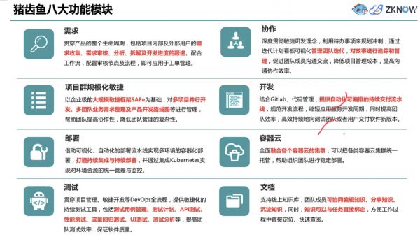 随着产品的不断迭代更新和完善,当前「猪齿鱼」产品功能已覆盖企业级软件、SaaS软件的研发管理、项目管理、运营管理全流程,主要有八大功能模块,分别是协作、需求、部署、测试、项目群规模化敏捷、开发、容器云、文档。产品功能辅以汉得自主产品研发转型方法论体系,可以帮助企业一站式提高研发和项目管理效率和质量,推动数智化转型升级。