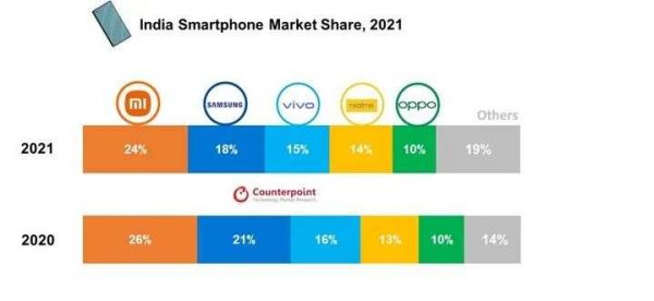 在印度市场,中国品牌的智能手机备受青睐,2021 年排名前五的品牌里有四家中国品牌,分别是小米(含子品牌 POCO)、vivo、realme 和 OPPO。中国手机的大卖,不仅因为好用又实惠,高端、中高端机型也受到肯定,小米、一加是该细分市场最亮眼的名字。