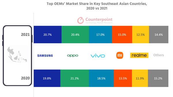 东南亚市场也有着相似的格局,市场前五的智能手机品牌之中,中国品牌占据四席。