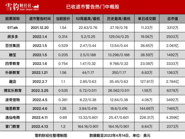 据雪豹财经社不完全统计,今年以来,房多多、百世集团、四季教育、趣店、逸仙电商、掌门教育、途牛等10多家中概股,因股价、市值等不符合美股持续上市标准,陆续收到交易所退市警告。