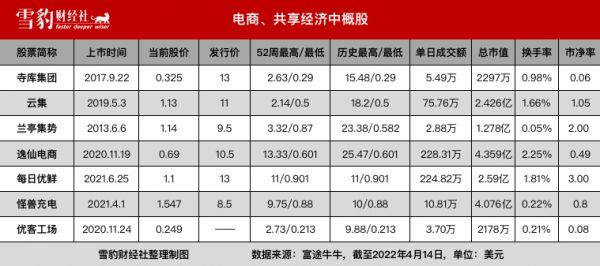 “奢侈品电商第一股”寺库、“国货美妆第一股”逸仙电商、“生鲜电商第一股”每日优鲜、“会员电商第一股”云集、“跨境电商第一股”兰亭集势、“共享充电第一股”怪兽充电、“联合办公第一股”优客工场等7只股票,股价均徘徊在1美元上下,其中有4只换手率不足1%,单日成交额仅10万美元上下。