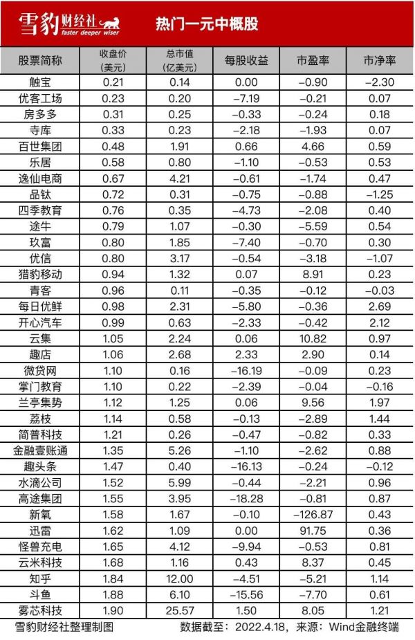 据雪豹财经社不完全统计,在34只股价跌至1美元上下的热门中概股中,市盈率为正的股票仅有8家,合计市值仅93.54亿美元。