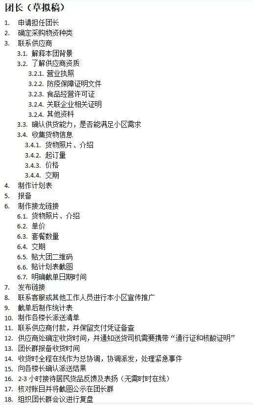 为了能顺利实现团购获得充足的食物,在与居委会多次交涉后,雪儿还特别拟定了从渠道、资质、统计、采购、运输、收货、消杀、分装、配送、售后、复盘一系列章程,并且招募了一群年轻人,分工协作满足整个小区的物资需求。