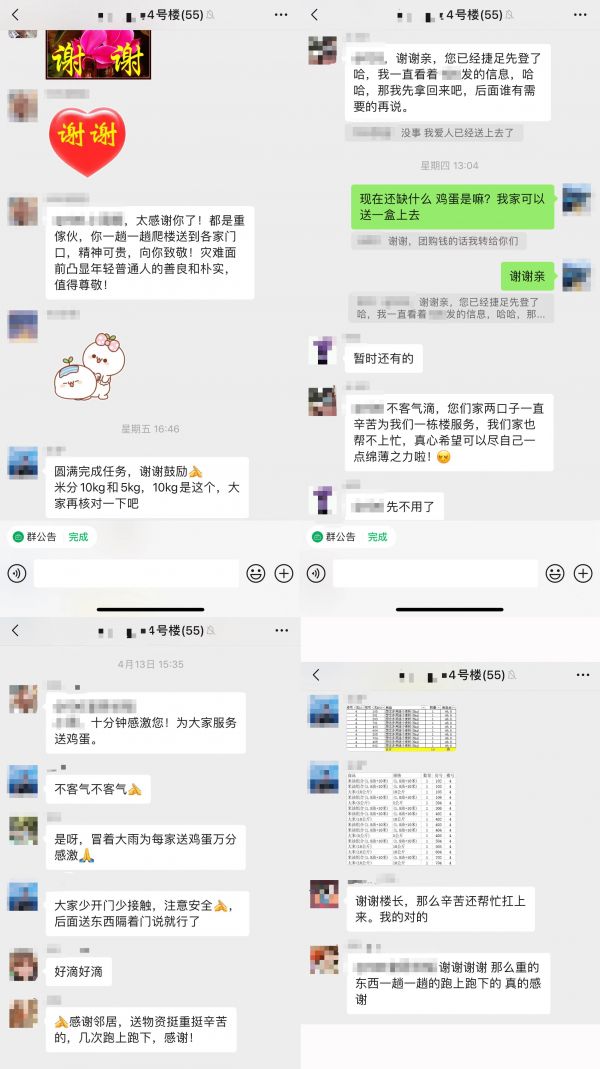 参与团购工作的小伙伴们,也因为这样的经历成为了好朋友。目前雪儿所在的团购工作组已经汇聚了楼长、后勤、消杀、客服、数据统计等服务人员,甚至还有专门的‘爬楼’客服。“因为社区有很多老人,他们看消息不及时,错过重要消息之后也会在群里问,这时候就有‘爬楼’客服在微信群里爬楼翻消息,给他们解答问题。不仅这样,考虑到老年人行动不便以及不会用智能手机等问题,我们也安排了专门的小伙伴上门询问他们的需求,尽力做到团购不漏掉任何人。”