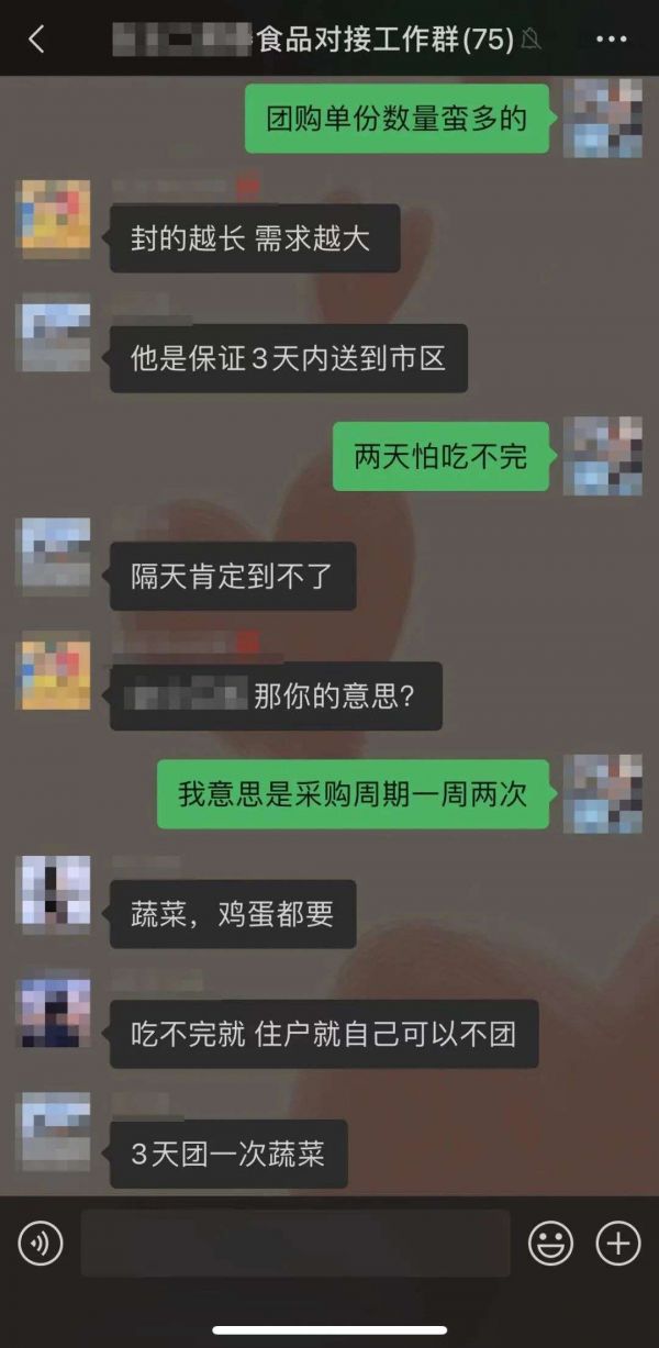 “一开始社区居委会管理的很严格,不放心外面的货源渠道,毕竟小区已经出现阳性了,作为居民我们其实也是很理解,但真的要饿肚子了,不团购还能怎么办?别的小区各种买买买的时候,我们连温饱都还没解决。好在社区最后是同意了,作为活跃分子的我也自然而然成为对接供应商、带领大家团购物资的团长。”雪儿分享到。