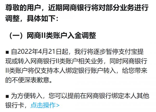 4 月 19 日,网商银行发布公告称,自 2022 年 4 月 21 日起,将逐步暂停支付宝提现或转入网商银行 Ⅱ 类账户相关业务,同时网商银行 Ⅱ 类账户将仅支持本人绑定银行账户转入。