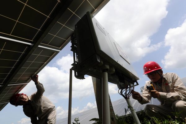 工人在勘察光伏逆变器的运行情况。图片来源:视觉中国