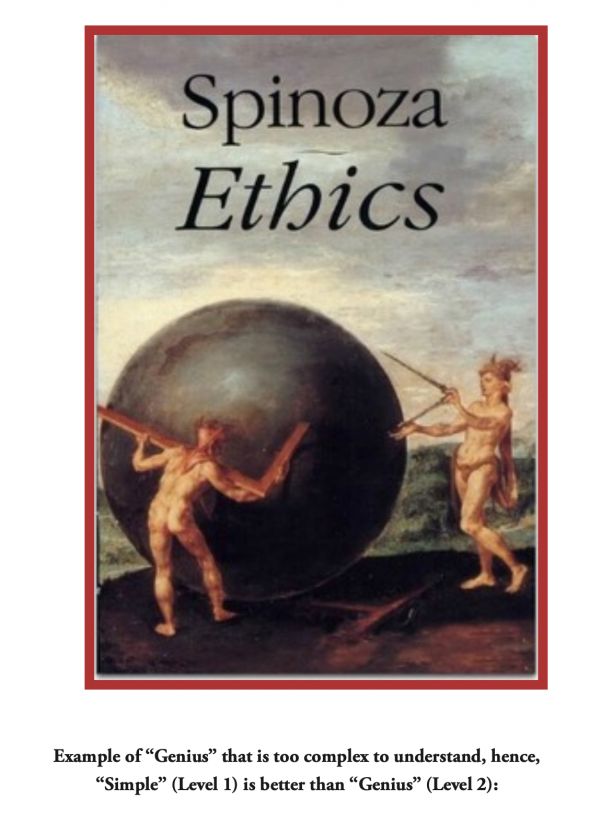 为什么简单,对的那种简单,比天才还要好?因为你能理解!我买了这本书——通常在做这样的演讲时我都会带上这本书。这是斯宾诺莎的《伦理学》。斯宾诺莎这本《伦理学》实在是天才之作。但你猜怎么着?里面的东西你完全看不懂。但是我刚才介绍的东西,镜像互反,你能理解吧?好的。