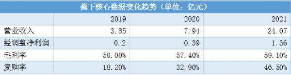 在其递交的招股书中,营收净利一栏的数据相当之华丽。2019年至2021年三年间,蕉下营业收入分别为3.8亿元、7.9亿元和24.1亿元。仅用三年时间营收便翻了6倍,年复合增长率高达150%。
