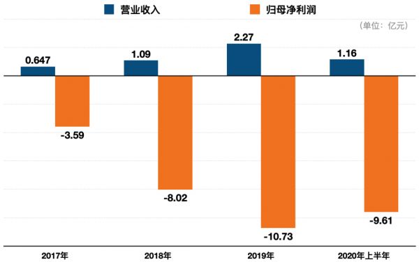 2020年底,柔宇科技向科创板提交的招股书显示,2017年至2020年上半年的报告期内,柔宇科技分别实现营收0.65亿元、1.09亿元、2.27亿元、1.16亿元,同期归母净利润为-3.59亿元、-8.02亿元、-10.73亿元和-9.61亿元,亏损总额近32亿元。