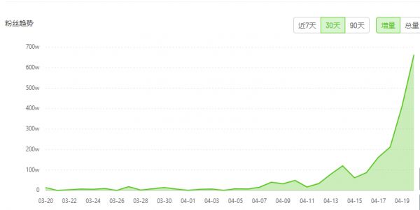 一周五天在抖音直播燃脂健身操,7天时间涨粉超过1000万,近30天直播累计观看人次超1亿,创下了2022年抖音直播记录。他的抖音最新粉丝数已超2500万,逼近李佳琦的一半,而在4月1日这一数字仅为331万,20天涨粉近2200万。