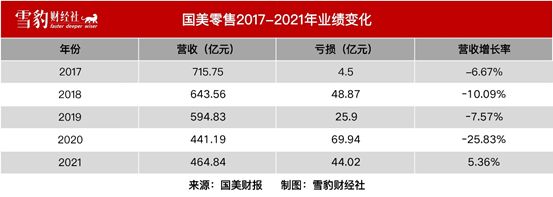 2022年3月31日,国美零售(HK:00493)披露了2021年财报,黄光裕交出了复出第一年的经营成绩单。虽然财报显示,全年总营收464.84亿元人民币,同比增长5.36%,但是,在过去5年里,国美总营收并未取得突破,且持续亏损大势未改(见下图)。