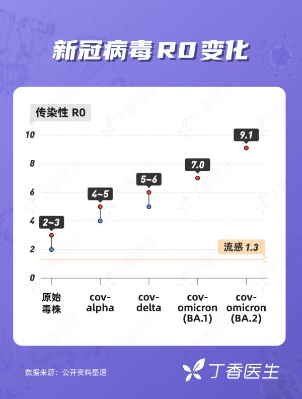 新冠病毒原始毒株的 R0,大约为 2~3,与流感一个级别。而现在,奥密克戎的 R0 已经达到了 9.1,甚至有研究观察结果高达 12——逼近迄今传染性最强的呼吸道病毒,麻疹。