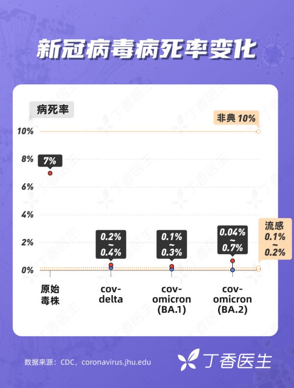 从各国报道的数据来看,奥密克戎 BA.2 的病死率在 0.04%~0.7% 之间, 而原始毒株的病死率在 7% 左右。