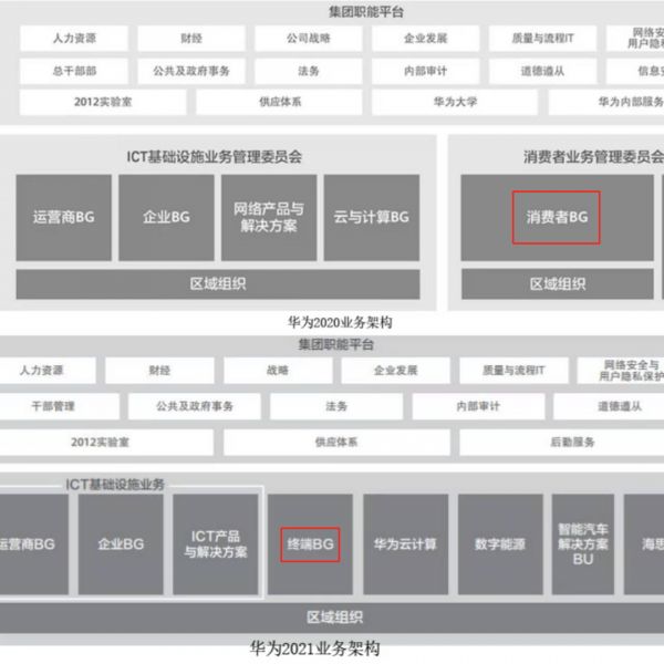 随之一起调整的,还有华为海思从2012实验室下的二级部门,独立成为与华为云计算、智能汽车解决方案BU并列的一级部门,以及2021年新成立的华为数字能源业务,与原有的三大BG业务并列成为华为一级部门。