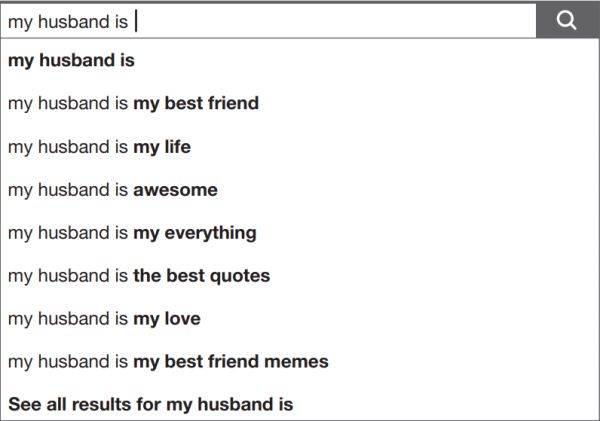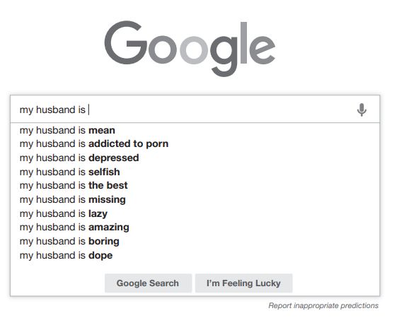 可以看到这些自动补全都是甜蜜的。因为在脸书上,人们会尽可能把生活描述的尽可能好。但如果将同样的内容放到谷歌搜索中,就会看到非常不同的结果: