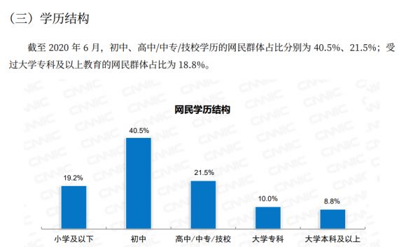 根据第46次《中国互联网络发展状况 统计报告》,可以看到,大学本科及以上的网民只占8.8%。