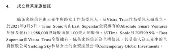 甚至,这对夫妇还设立了家族信托,分散风险、资产保值。王路夫妇将自己控股的Time Sonic 99%分别转移到王勤松的Yiedling Sky(占比49%)及路长梅的Contemporary Global Investments(占比51%)。