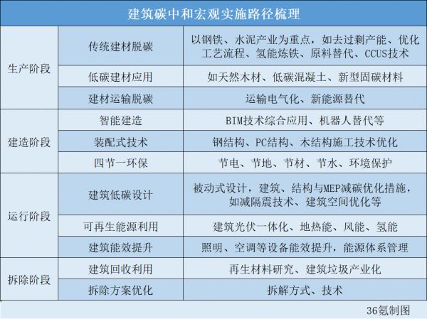 比较有趣的是,在推动建筑碳减排的过程中,一方面,建筑业每个环节中要做的事情都比较明晰。比如在生产阶段,进行传统建材脱碳、低碳建材应用等;在施工阶段,促进装配式施工、数字化技术使用;在运行阶段,尽可能实现能源替代、电气化及能效提升;在拆除阶段,完善拆除方案优化、建材回收利用等。