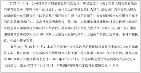 据财报显示,截至2021年12月31日,360集团已就第一步交易涉及的转让协议履行了全部9亿元出资义务,并已就第二步交易涉及的增资协议支付了第一笔人民币10亿元增资款,剩余人民币10亿元增资款尚未支付。2021年12月27日,上述两步交易所涉及的股权交易已完成工商登记。截至2021年12月31 日,360集团对哪吒汽车的持股比例约为 14.96%。