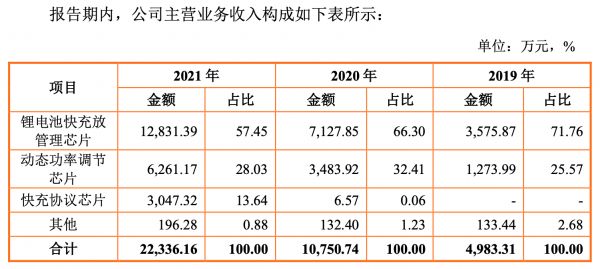 报告期内,智融科技的主营业务收入迅速增长,复合增长率达111.71%。其中,锂电池快充放管理芯片是公司营收的主要来源,2019年-2021年营收分别为3575.87万元、7127.85万元、1.28亿元,占总营收比均超过50%。
