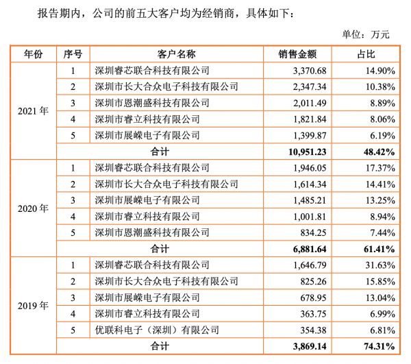 报告期内,智融科技的前五大客户均为经销商,且都是深圳公司,销售收入合计分别占营收比例为74.31%、61.41%、48.42%,主要客户稳定且集中度相对较高,但还未出现单一客户销售占比超50%的情况。