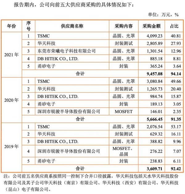 报告期内,智融科技的前五大供应商较为稳定,包括台积电、华天科技、东部高科、甬矽电子、荣曦电子(2021年)、锐骏半导体(2020年、2019年)。2019年-2021年,公司向前五大供应商的采购金额分别为3609.71万元、5666.45万元、9457.08万元,占当期采购总额比例分别为92.42%、91.35%、94.14%。