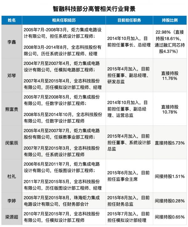 此外,截至招股书签署日,智融科技共拥有5名核心技术人员,其中除了李鑫、邓琴、闵紫辰外,模拟设计部经理梁源超也曾担任全志科技的模拟设计部工程师。公司的财务总监李婷曾担任珠海炬力的财务部会计。