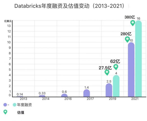 截至2021年2月,公司已经筹集了近20亿美元资金,包括由富兰克林邓普顿领投的10亿美元G轮融资,此时Databricks估值已经达到280亿美元;在经过最新轮融资后,Databricks380亿的身价与三年前的62亿相比暴增了近13倍。