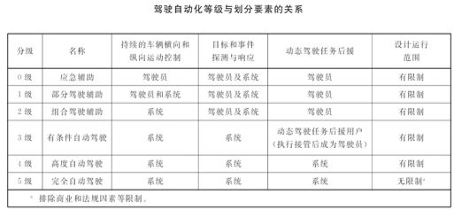 该标准规定了汽车驾驶自动化分级遵循的原则、分级要素和技术要求框架,并且基于驾驶自动化系统能够执行动态驾驶任务的程度,以及角色分配和运行范围限制,而将驾驶自动化等级划分为0级至5级,共6个级别。