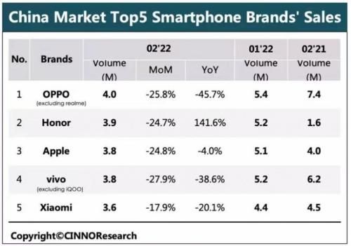 实际上在推出这么多新机后,vivo的境况是每况愈下。据CINNO Researc报告,2月oppo以约400万台的销售量稳居第一,荣耀取代vivo第二的位置,而vivo则跌落至第四名,销量同降38.6%。