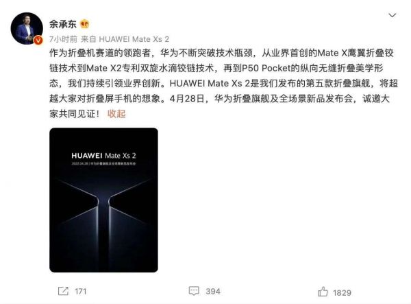 在去年年底,华为带来了自家首款上下翻折的(翻盖)的折叠屏手机华为P50 Pocket,也进一步拓展了自家的折叠屏产品线。 就当我以为华为之后都会将内折的华为Mate X系列和翻盖的Pocket作为出货主力军时,在4月22日华为官宣将在4月28日发布旗下第五款折叠屏手机华为Mate Xs 2。