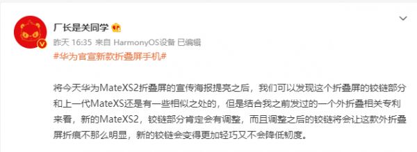 不过在其他方面,华为Mate Xs 2可能会带来不一样的使用体验,根据博主@厂长是关同学的微博爆料显示“结合此前发过的外折叠相关专利来看,新的Mate Xs 2铰链部分肯定会有调整,而且调整之后的铰链将会让这款外折叠屏折痕不那么明显,同时,新的铰链会变得更加轻巧又不会降低韧度”。简单来说,华为Mate Xs 2会是同时兼顾耐用和轻薄的一款折叠屏手机,或许也是市面上最轻薄的折叠屏手机之一。