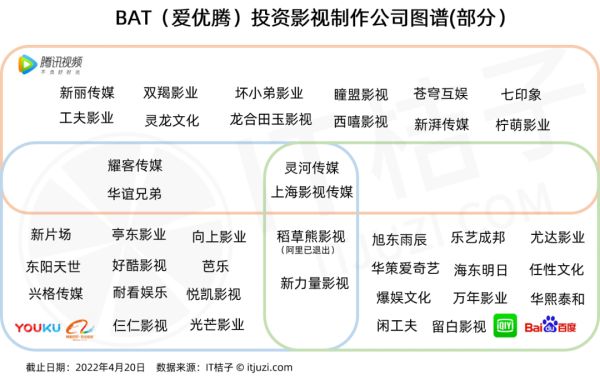 在 《影视寒冬怎么办?近 20 家知名制作公司已抱上了腾讯的大腿》 一文中,IT 桔子已经对以「爱优腾」为代表的平台与影视制作公司之间的业务协作模式进行探讨,本文重点以「爱优腾」即 BAT 在影视制作行业的投资版图进行分析。