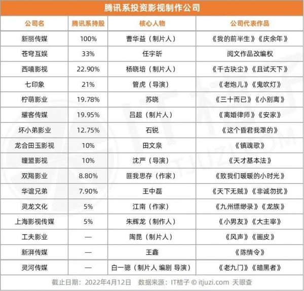 腾讯在影视制作领域除与阿里共同投资的 4 家公司外,还入股 12 家影视制作公司。12 家公司中持股 10% 以上的有 8 家,持股 20% 以上的有 4 家。