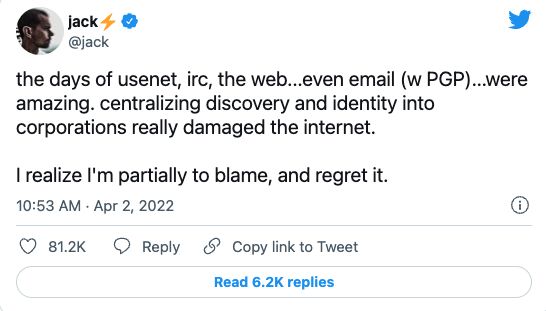 此后他也多有倡议,认为社交媒体的内容决定权不应该集中在平台手中,而应该交到用户手中,允许用户掌控自己的网络数据,核心技术算法与内容标准应该公开透明,让所有人清楚哪些内容是不被允许的。这是web 3.0时代的社交媒体平台所应具备的去中心化特性。